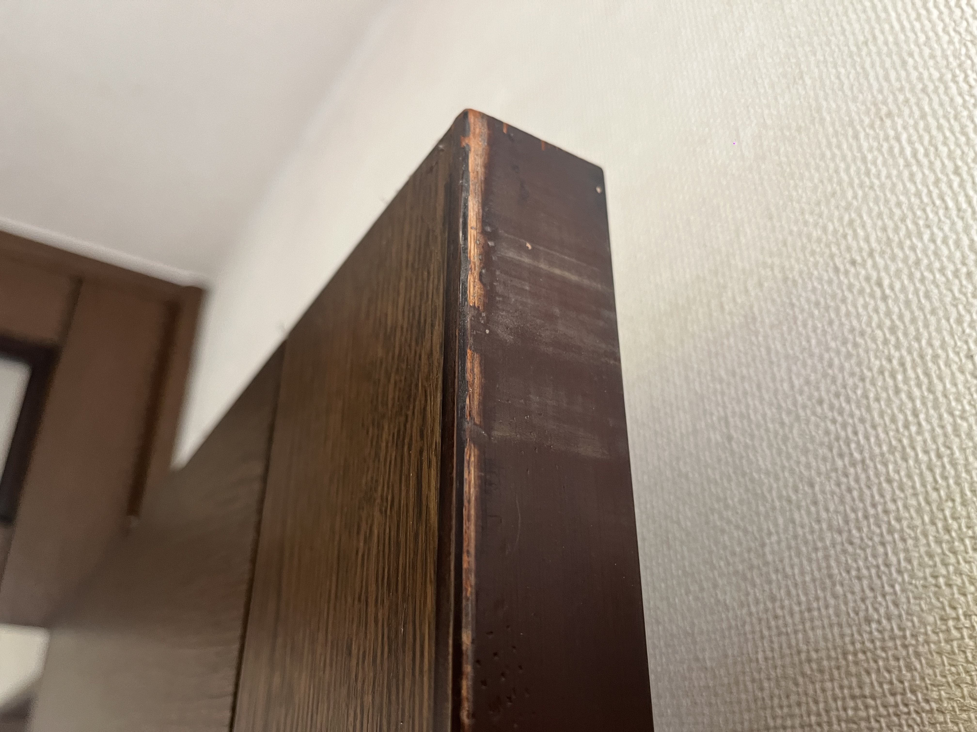 さらに、東日本大震災の際に玄関上の壁に大きなひびが入った経緯があり、そのタイミングで室内の枠も歪んだ可能性が高いとのことでした。それ以降もベランダ側の風で強く閉まり続けた影響が積み重なり、蝶番・枠・ドア本体の全体に歪みが広がっていたようです。
