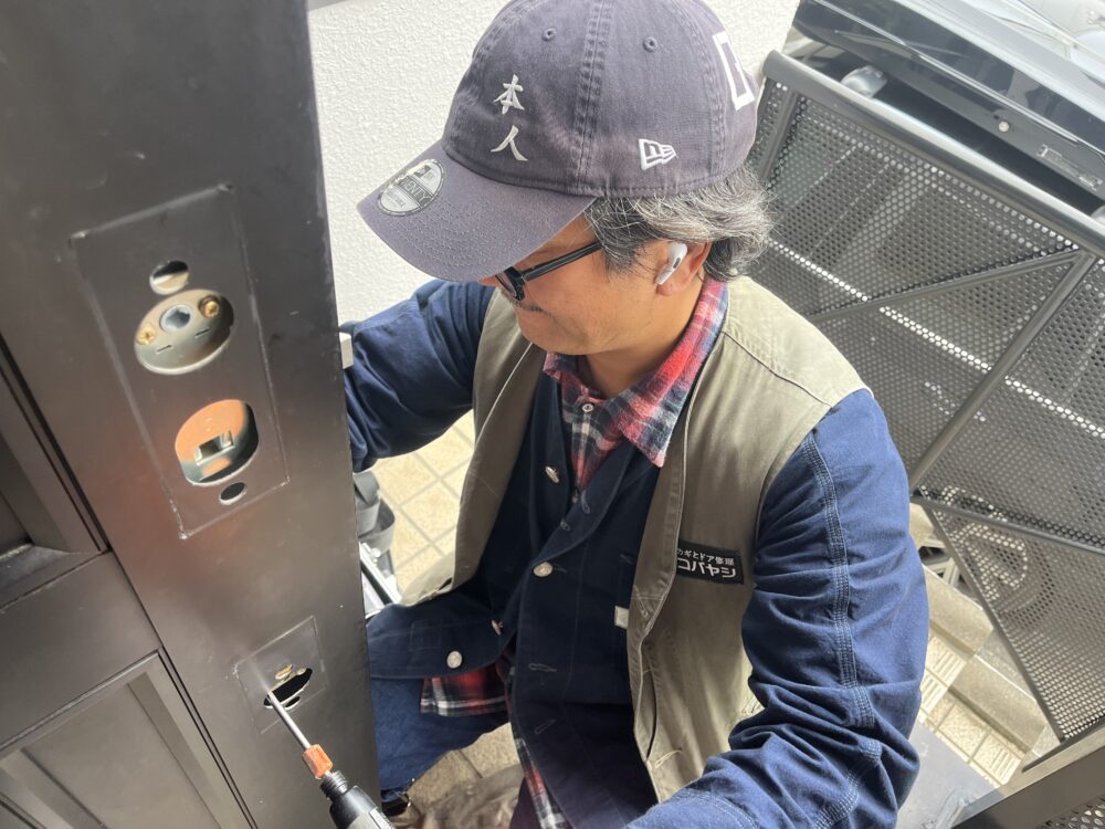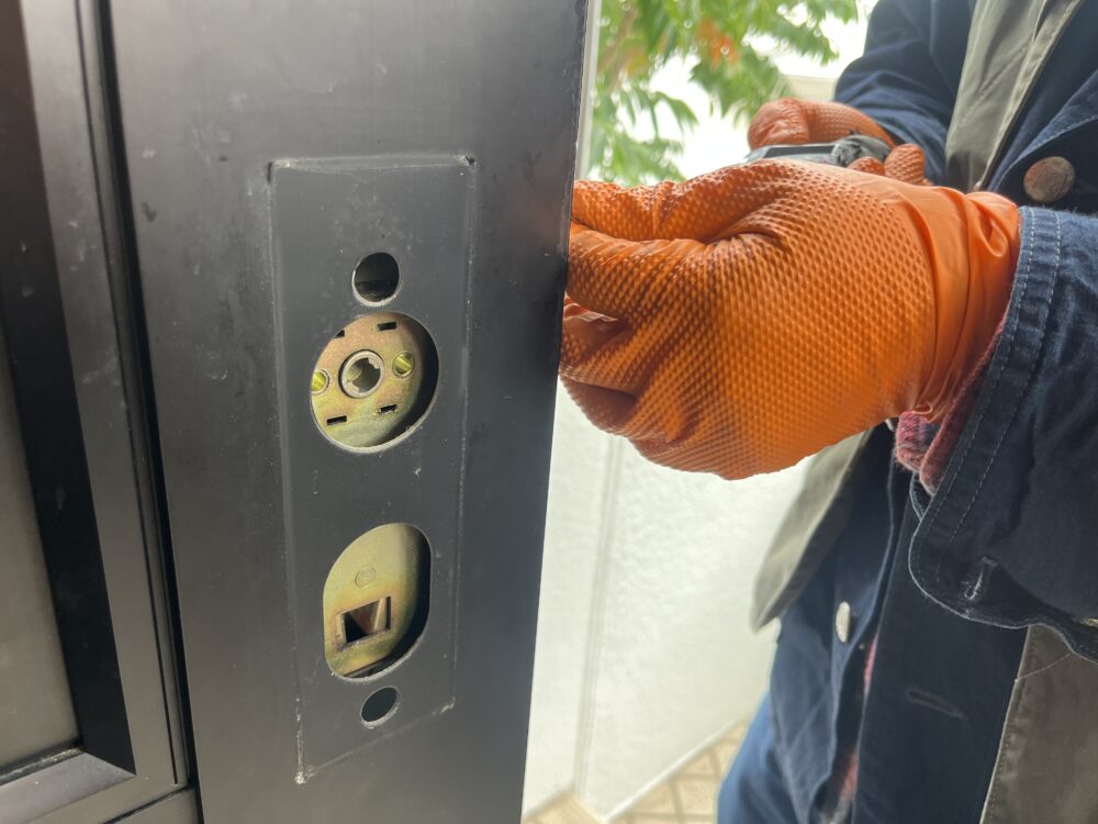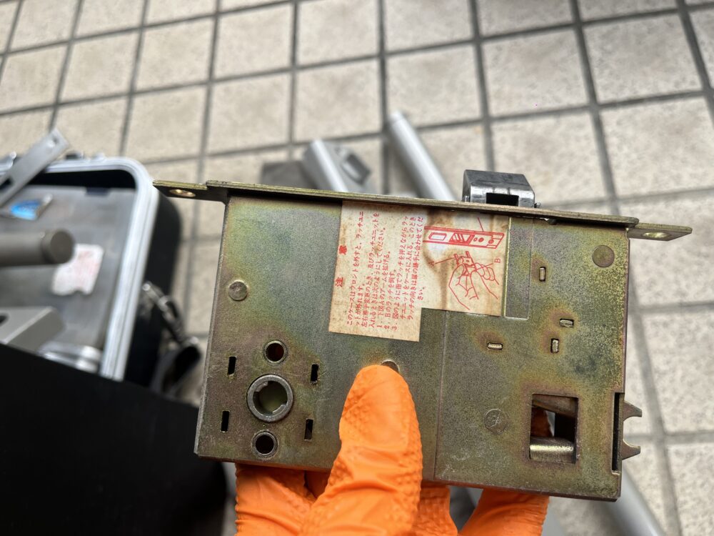 実際に確認すると、ドア内部の錠ケース(ラッチ・デッドボルトを一体で制御する金属パーツ)が破損しており、ラッチボルトが戻らないため、外から開けられない状態でした。