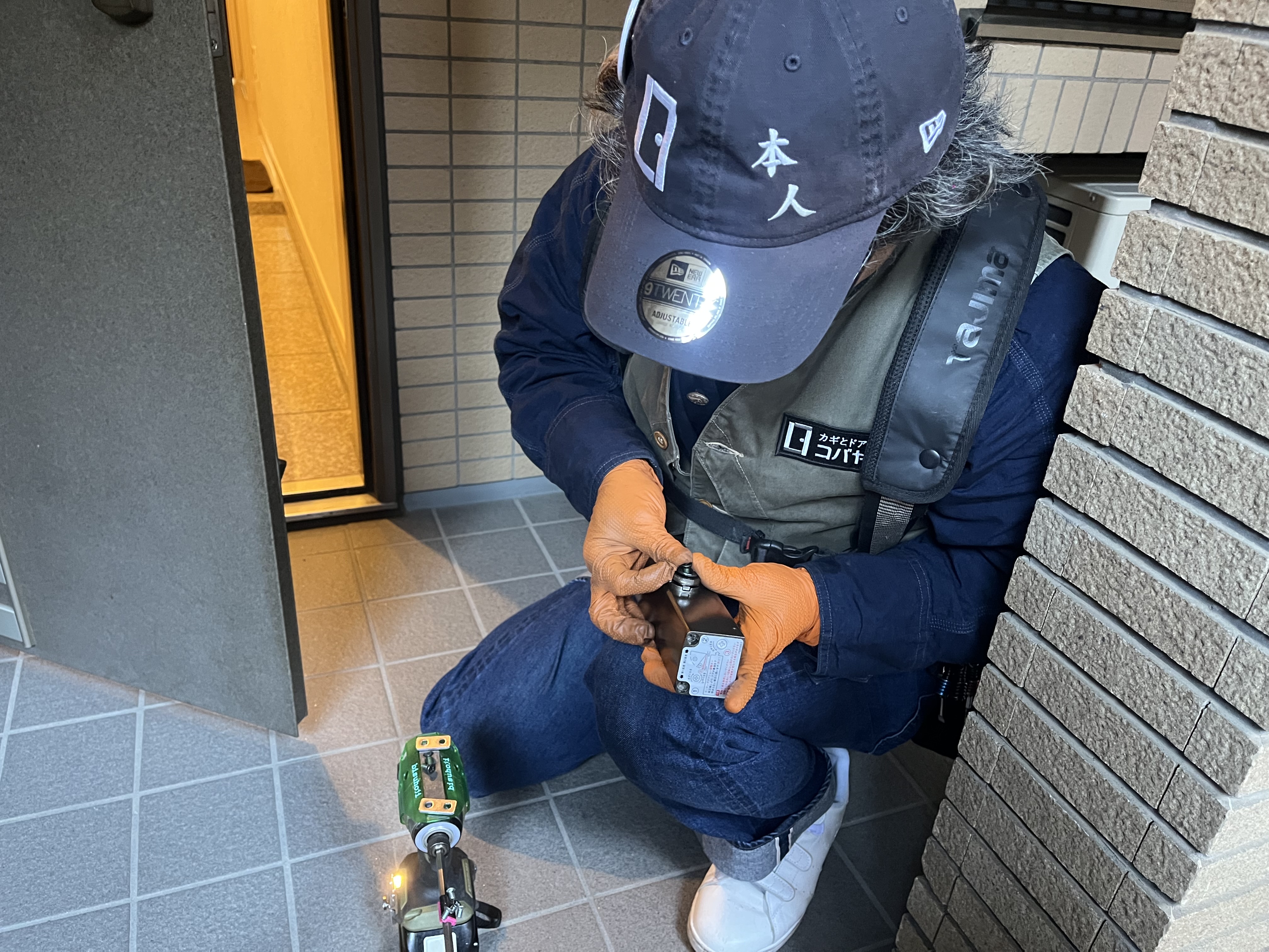 玄関ドアのクローザー本体が ドア側から完全に外れてぶら下がっている 状態で、ドアは勢いよくバタンと閉まり、その衝撃が長期間続いたことで ラッチボルトや錠ケース内部に深いダメージが蓄積していた 状態でした。