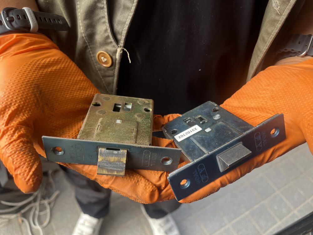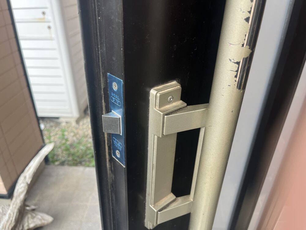 数ヶ月前から「鍵穴の動きが固い」「ドアの閉まり方が不安定」と感じていたそうですが、ついにラッチが完全に破損し、玄関がきちんと閉まらない状態に。