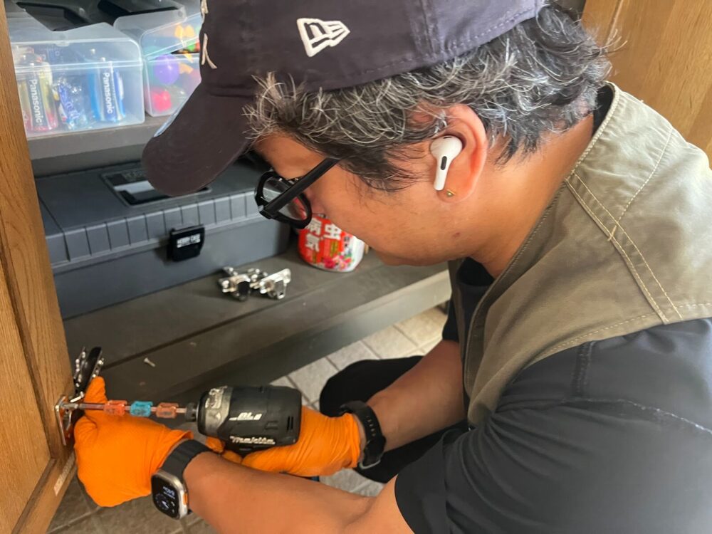 最初にご連絡をいただいた際には、扉片側の蝶番が完全に破損しており、応急処置として一部を交換。