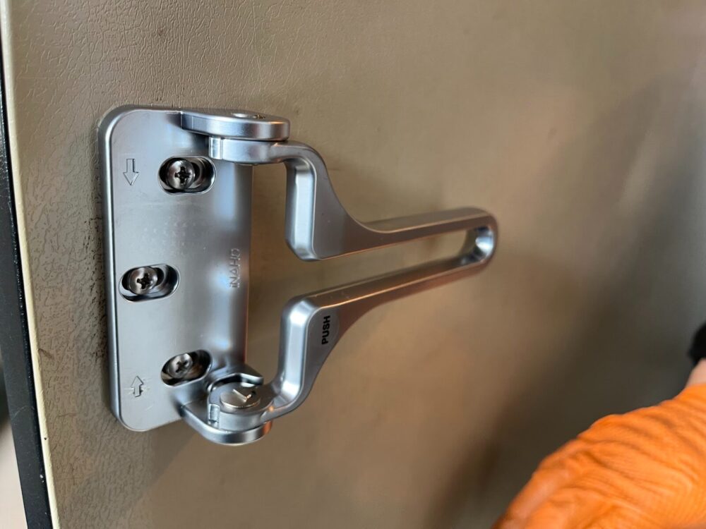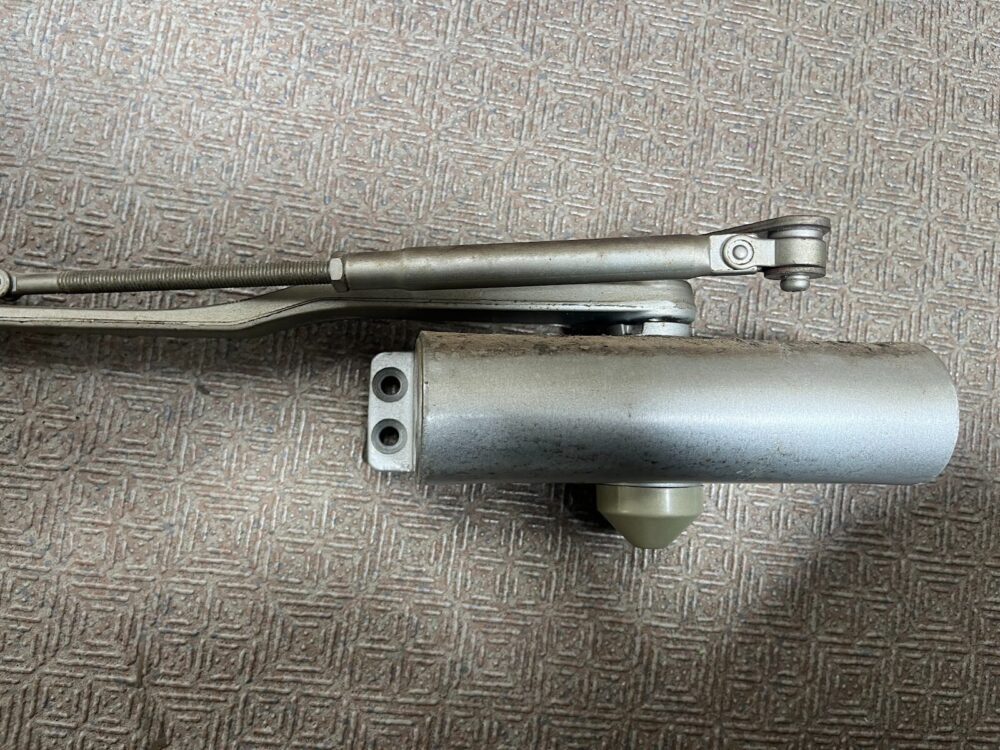 さらに、ドアクローザーについては、メーカー基準で約20万回(10〜15年程度)が耐用年数とされていますが、40年間一度も交換されていなかったため、内部の油が酸化・漏れを起こし、バネの伸び切りによる強い勢いでの閉まりが確認されました。このままでは鍵やバーロックが再び破損する恐れがあるため、新しいドアクローザーへの交換も併せて実施しました。