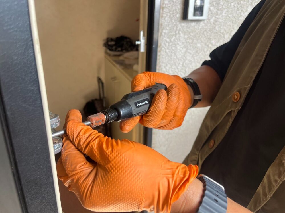 メーカー推奨では10年で交換が必要なところを40年間使い続けており、鍵穴の回りが固くなり、防犯性の面でも大きな不安がある状況でした。さらに、玄関のバーロック(内側補助錠)も不具合があり、ドアを閉めた勢いで勝手にロックが掛かってしまう恐れがありました。また、ドアクローザーも経年劣化で油漏れ・バネの劣化が見られ、ドアの開閉時に大きな音と衝撃が出てしまう状態でした。