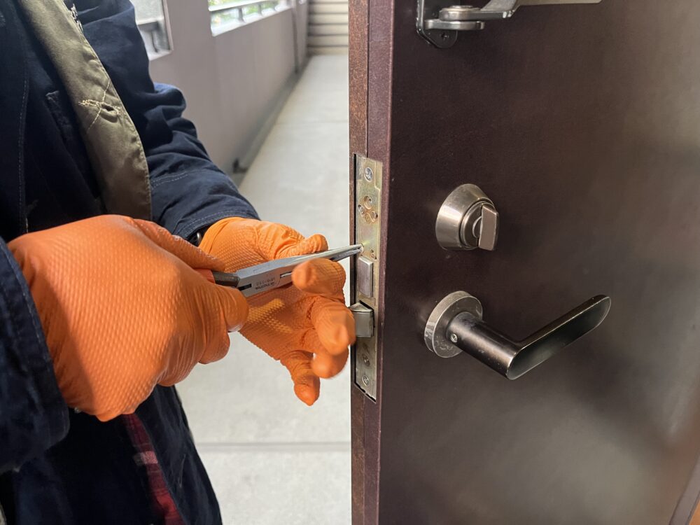 さらに、デッドボルト(かんぬき)とラッチボルト(ドアを仮固定する部分)が両方とも噛み込み気味で、ドアを閉めるたびに「ガガッ」と異音を出していました。