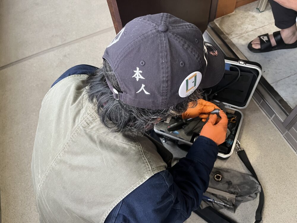 開閉はスムーズになり、ドア枠との干渉も解消。同時にドアクローザーも確認したところ、こちらも経年で油が抜けており、「バタン」と勢いよく閉まる状態でした。