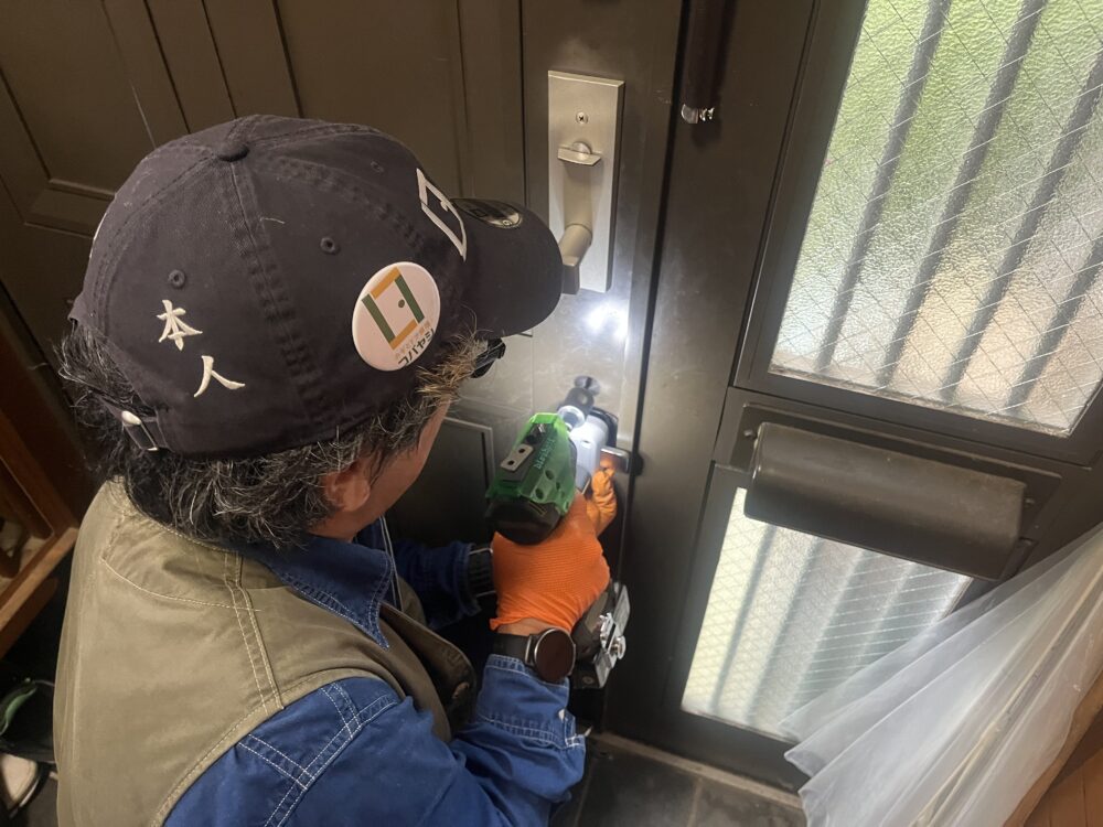 現場は築40年ほどの一戸建て。古いドアにも対応できるよう、既存の穴位置を活かして無加工で設置できるリプレイス仕様のディンプルシリンダーを選定。取り付けは慎重に行い、内側サムターン(つまみ式)を完全に排除した両面仕様に変更しました。これにより、お父様が誤って内側から開けてしまう心配がなくなりました。