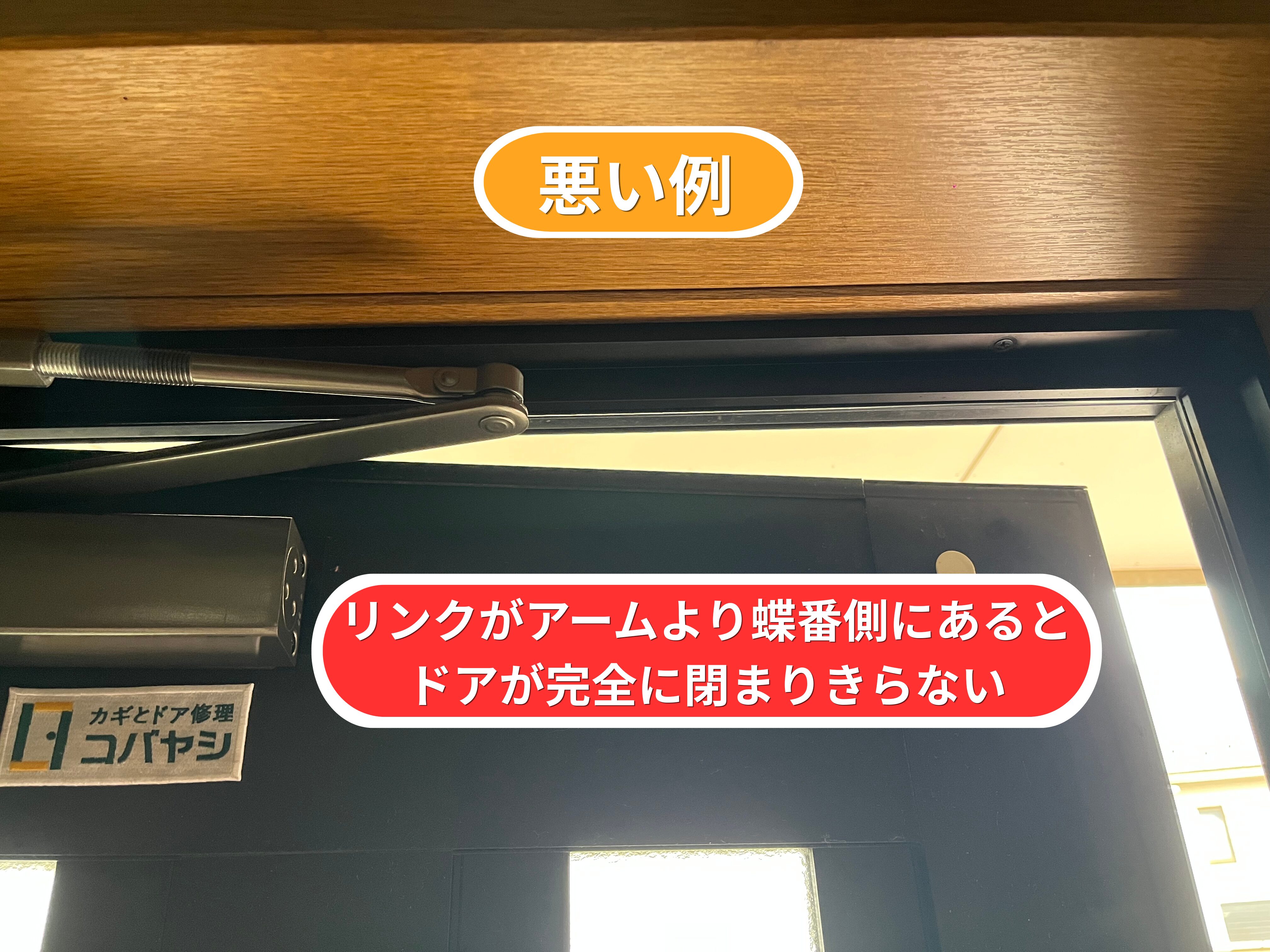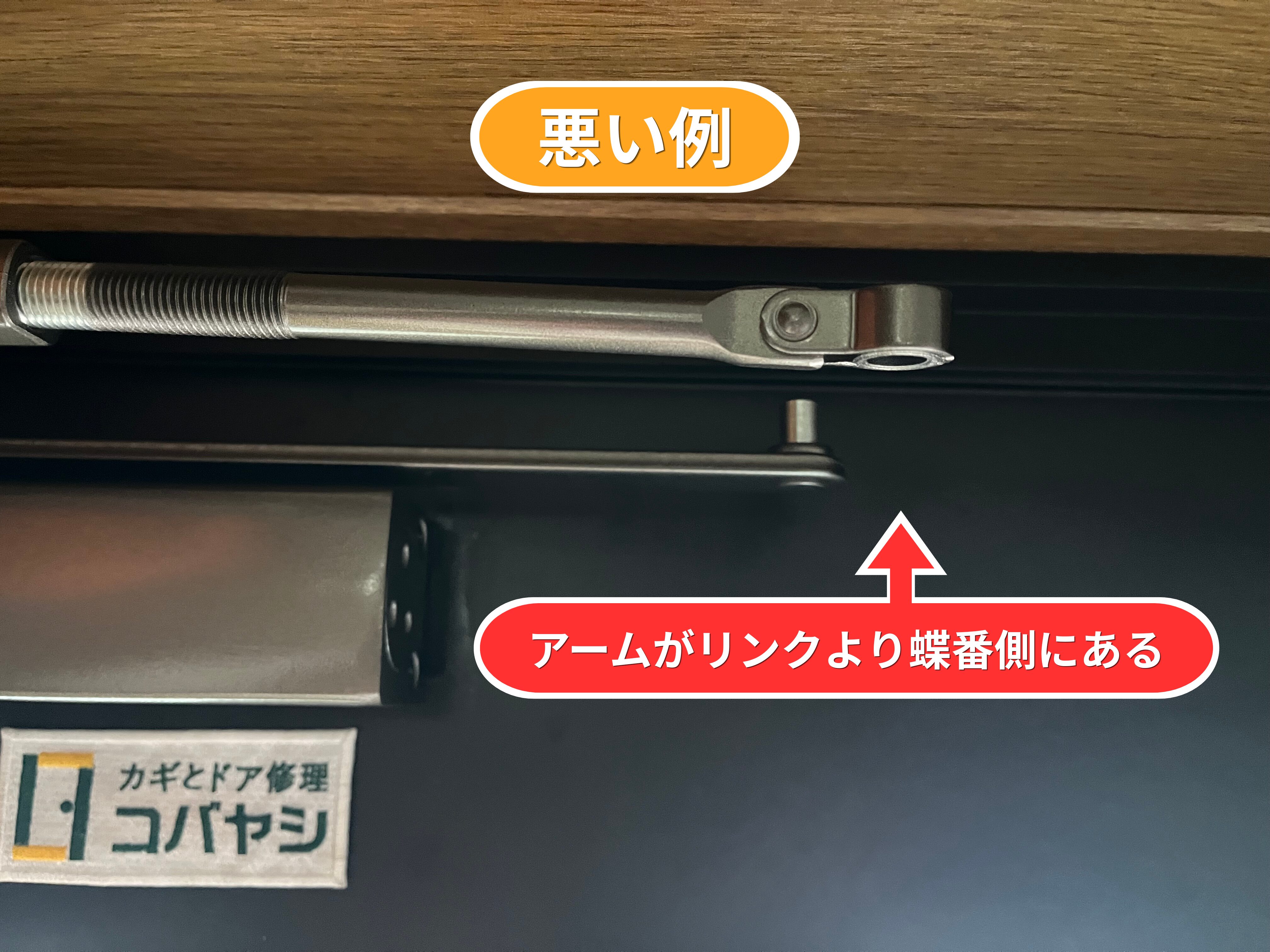 悪い例。アームがリンクより蝶番側にあるとドアが完全に閉まりません。