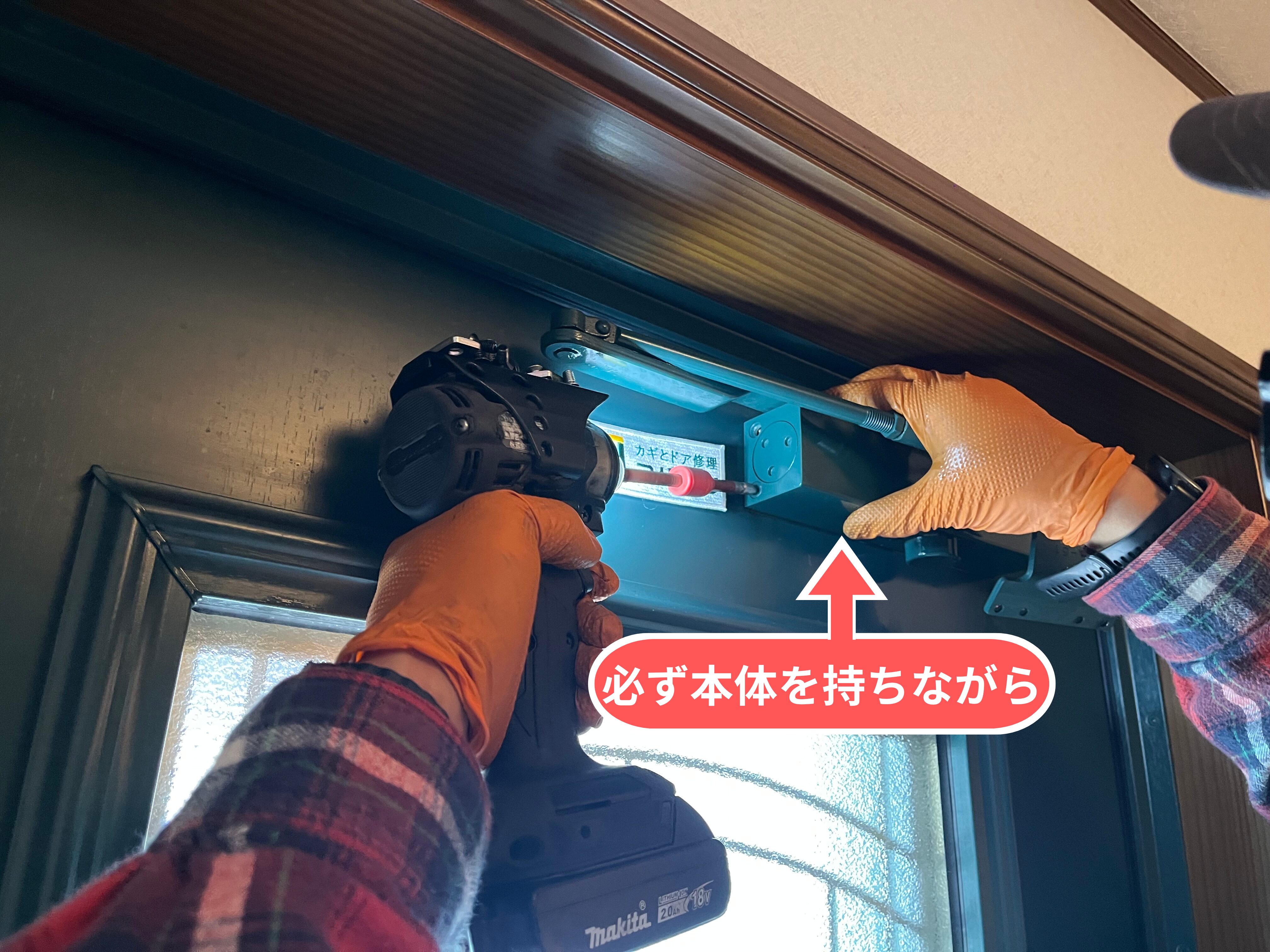 ドアクローザーの機能でブラケットが引っ張られている状態なので、蝶番側のネジから慎重に1本ずつ外しながらドアを閉じていきます。最後の1本の時にはブラケットやリンクを手で押さえて作業しましょう。